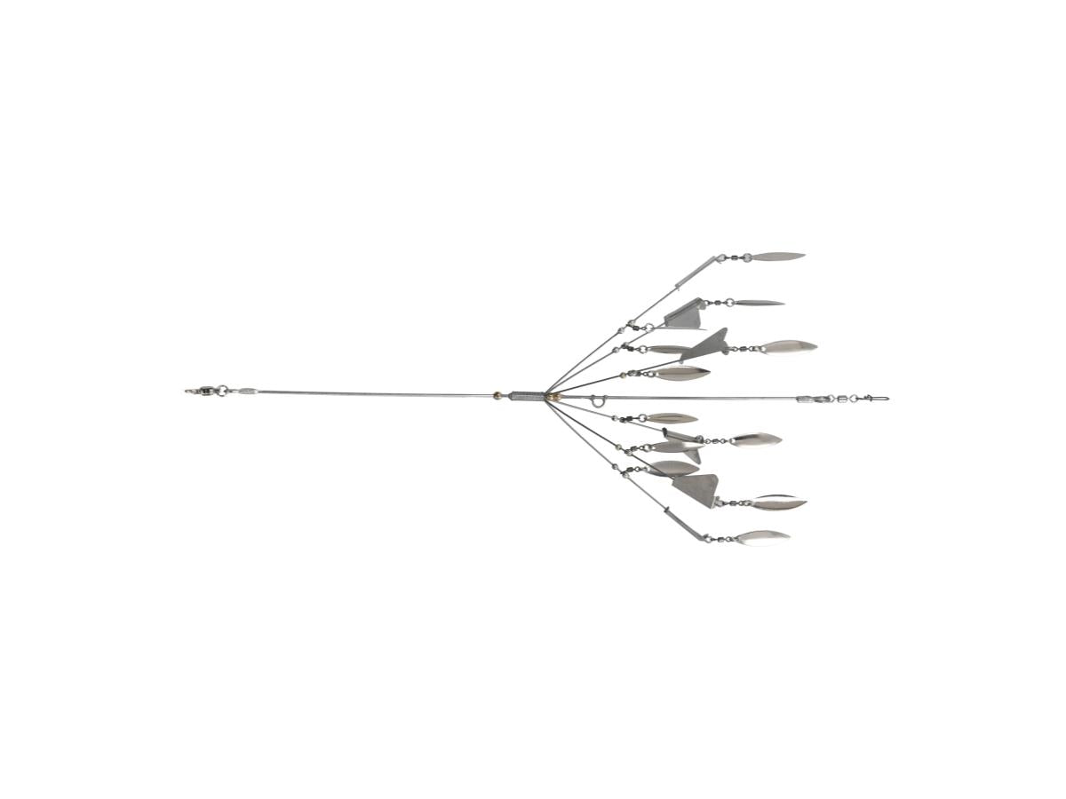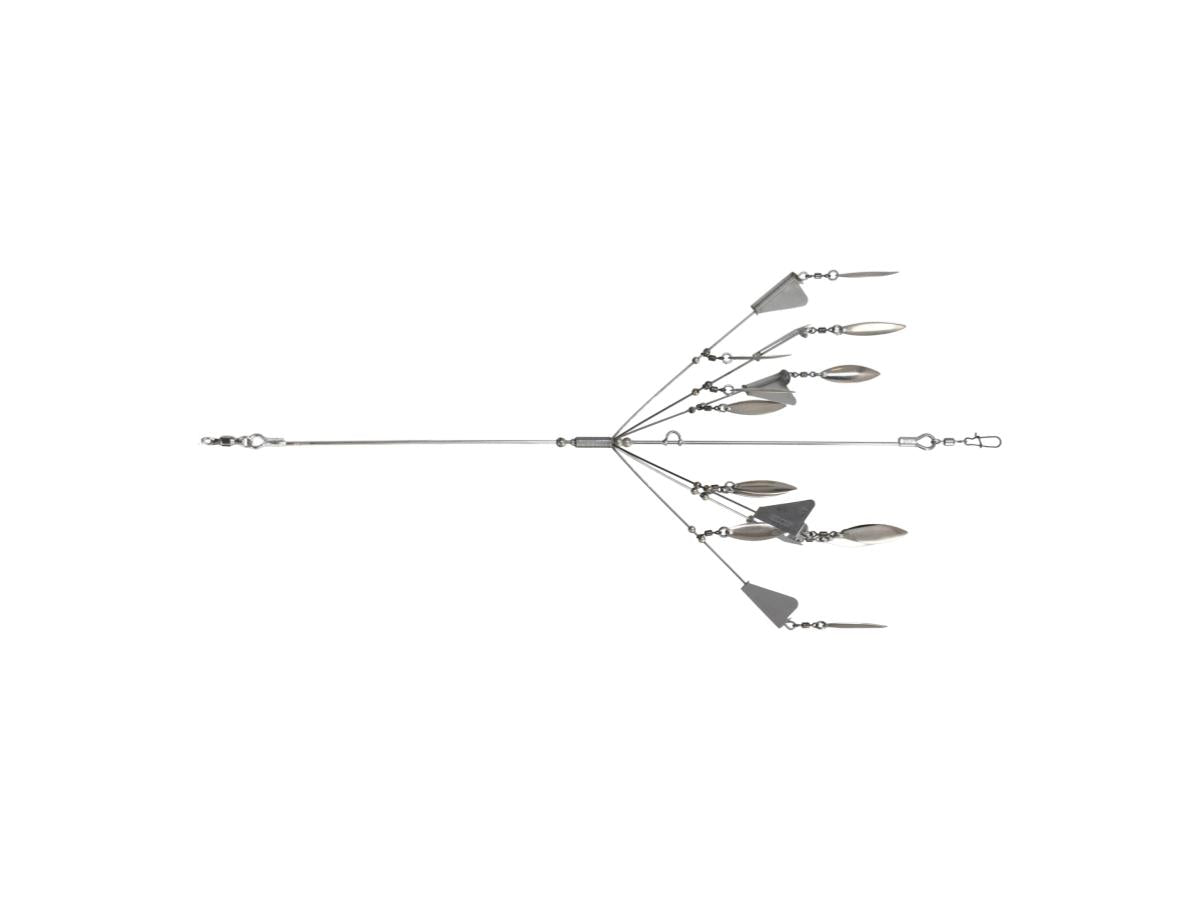 A new-sensation Alabama rig, mesmerizing with "rotation." It reproduces the look of baitfish fleeing and leaping out of the water. The proprietary "rotating umbrella unit" creates the illusion of an irregular bait school.